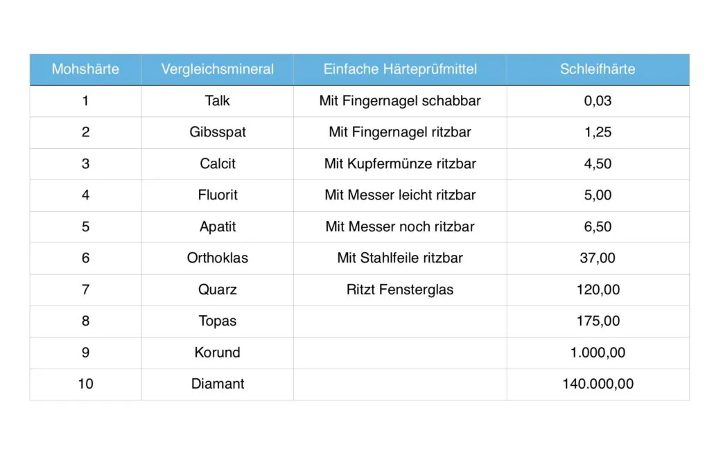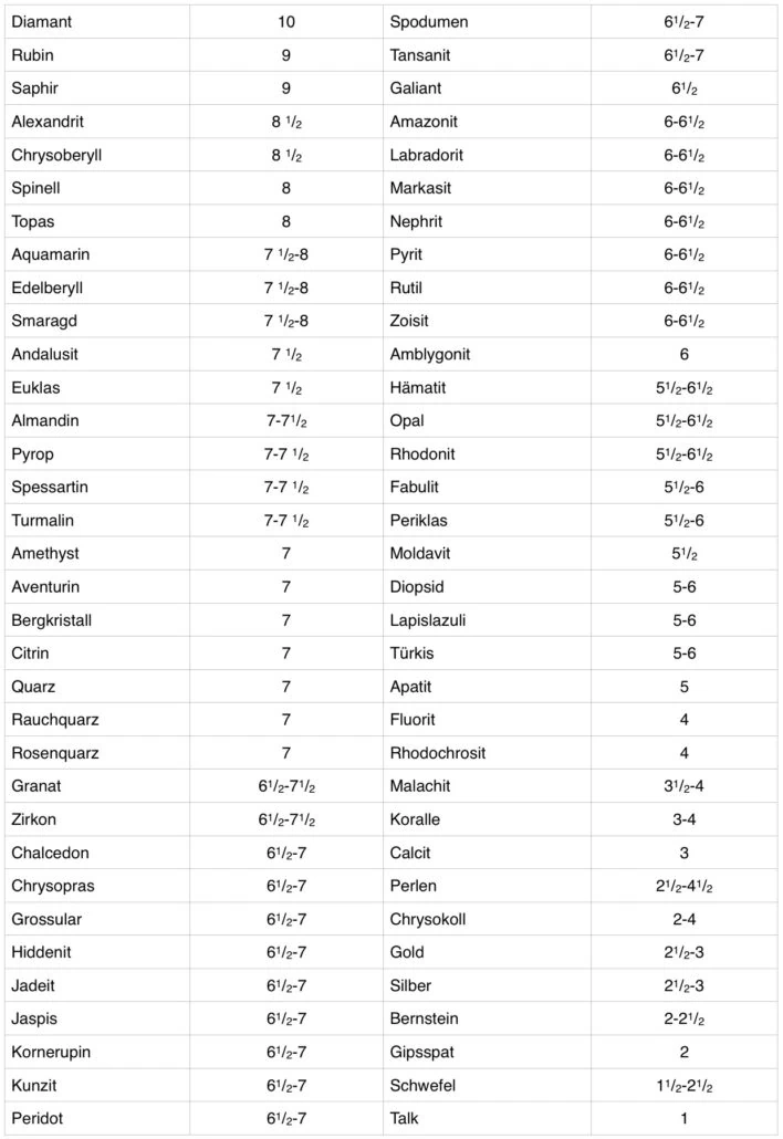 Alle uns heute bekannten Mineralien und Edelsteine sind dieser Mohsschen Härteskala zugeordnet.