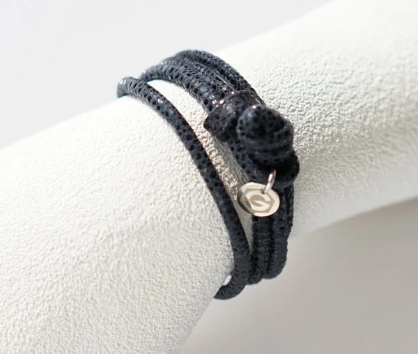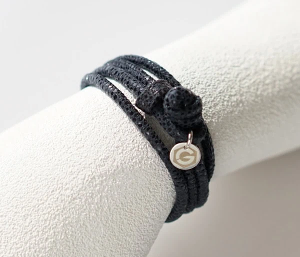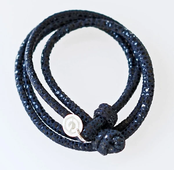 Armband mit Knebelverschluss aus rund gesäumtem, hochwertigem Soft-Nappaleder mit Galuchat Prägung in „nachtblau“.