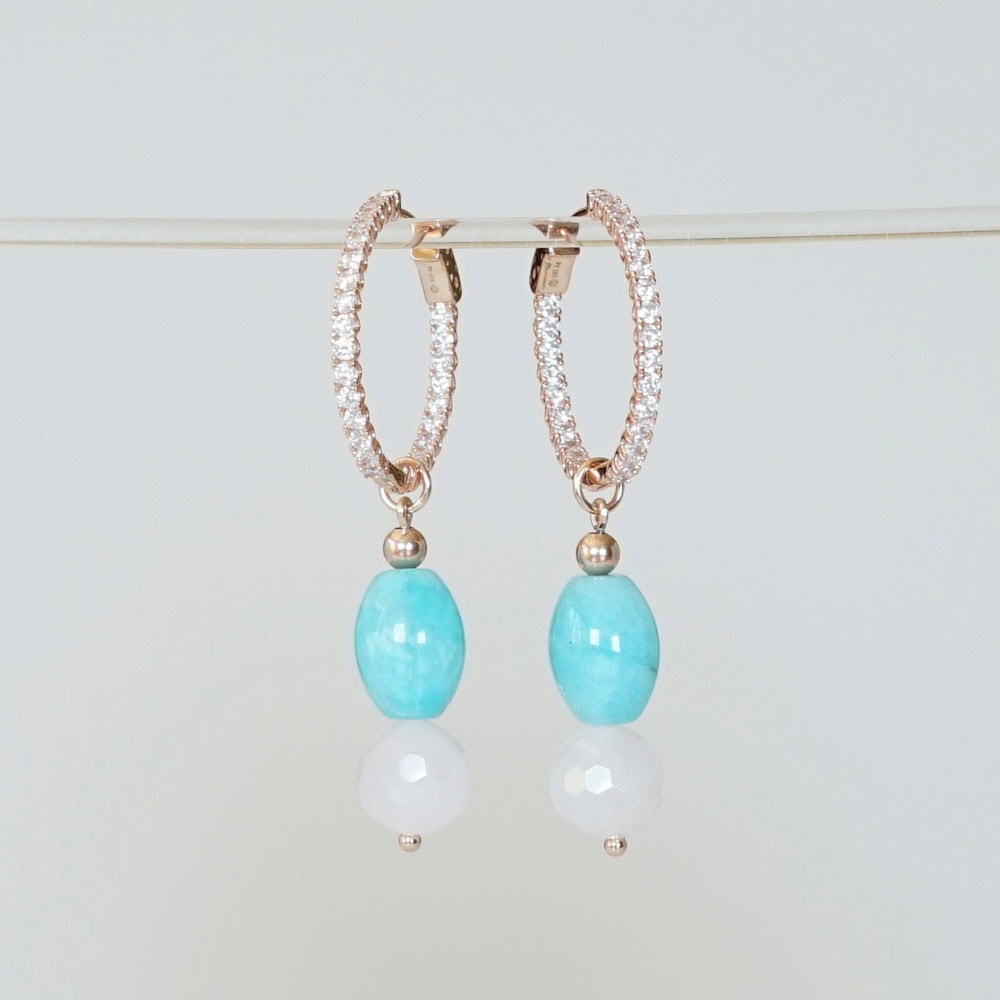 Creolen Ohrringe Rosegold Silber 925/000, 26 mm Durchmesser mit Zirkonia und Sicherheitsverschluss. Wir fertigen diese Creolen Ohrringe auf Wunsch auch in Gelbgold und in Weißgold. Die Einhänger mit facettiertem Rosa Quarz und Amazonit sind abnehmbar. Für weitere Einhänger sind diese Creolen perfekt geeignet. Extravagant und trendig. Einfach mal ausprobieren.