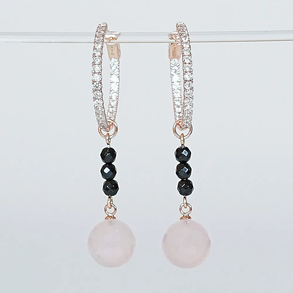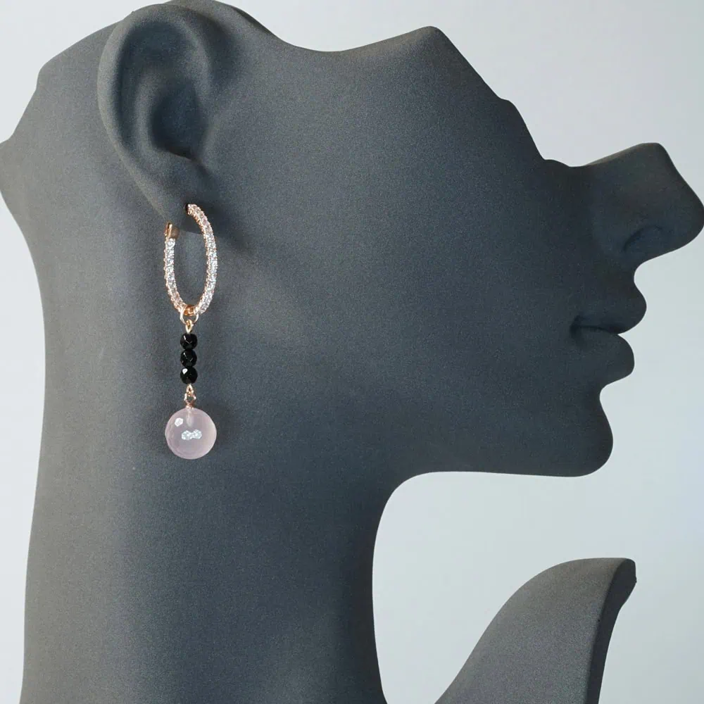 Creolen Ohrringe Rosegold Silber 925/000, 26 mm Durchmesser mit Zirkonia und Sicherheitsverschluss. Wir fertigen diese Ohrringe auch in Gelbgold und in Weißgold. Die Einhänger mit facettierten Rosaquarz Perlen und Onyx Beads sind abnehmbar. Für weitere Einhänger sind diese Ohrringe perfekt geeignet. Extravagant und trendig. Einfach mal ausprobieren.