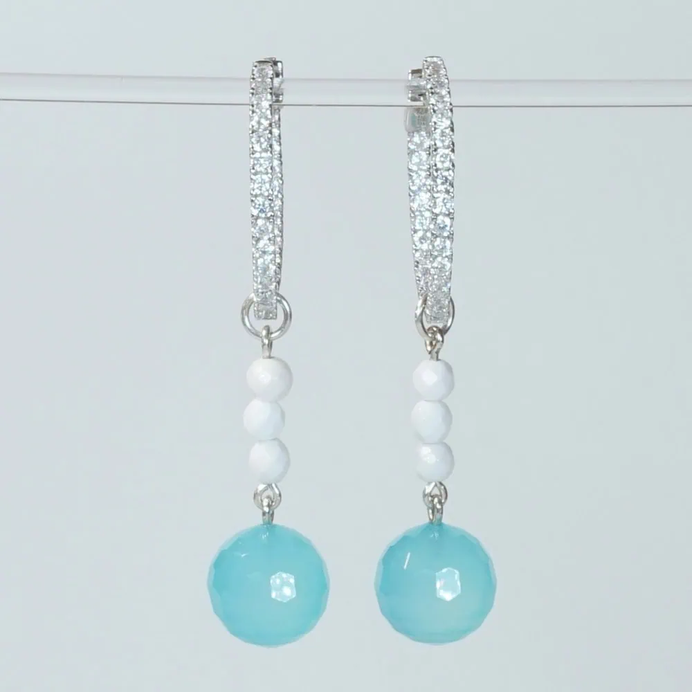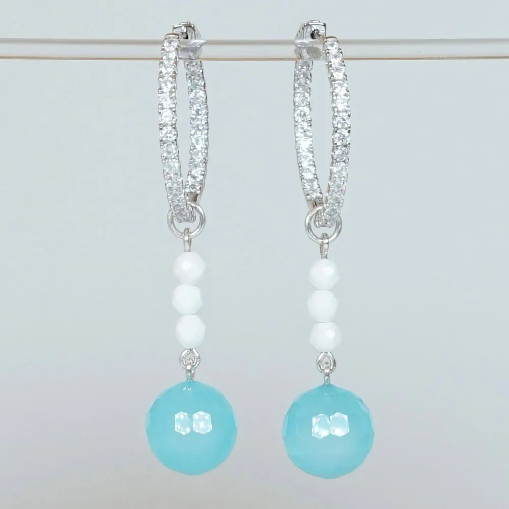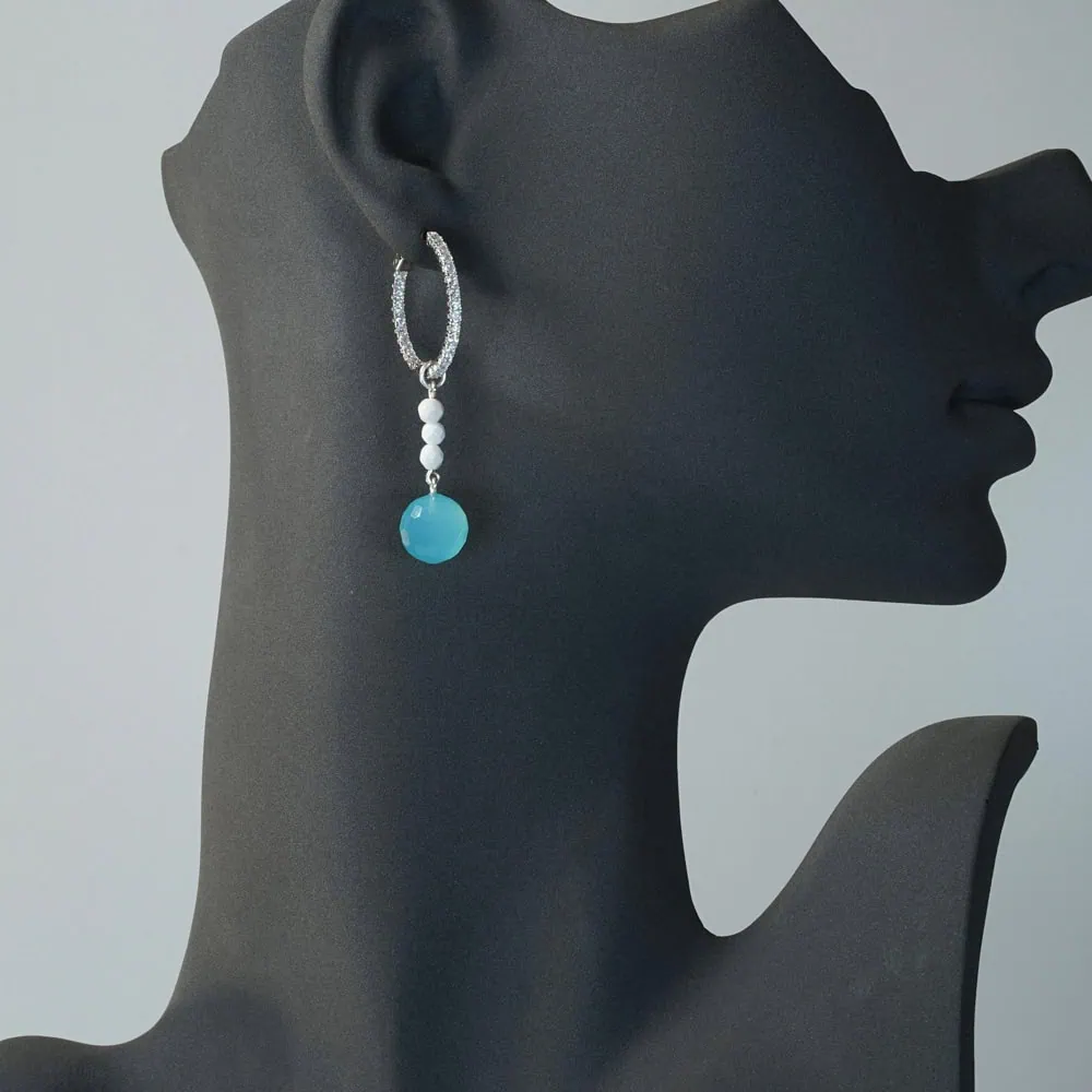 Creolen Ohrringe Weißgold Silber 925/000, 26 mm Durchmesser mit Zirkonia und Sicherheitsverschluss. Wir fertigen diese Ohrringe auch in Gelbgold und in Rosegold. Die Einhänger mit facettierten Chalcedon „Sea Blue“ Perlen und Kascholong Beads sind abnehmbar. Für weitere Einhänger sind diese Ohrringe perfekt geeignet. Extravagant und trendig. Einfach mal ausprobieren.