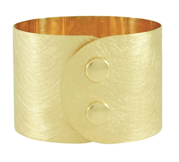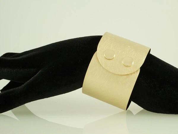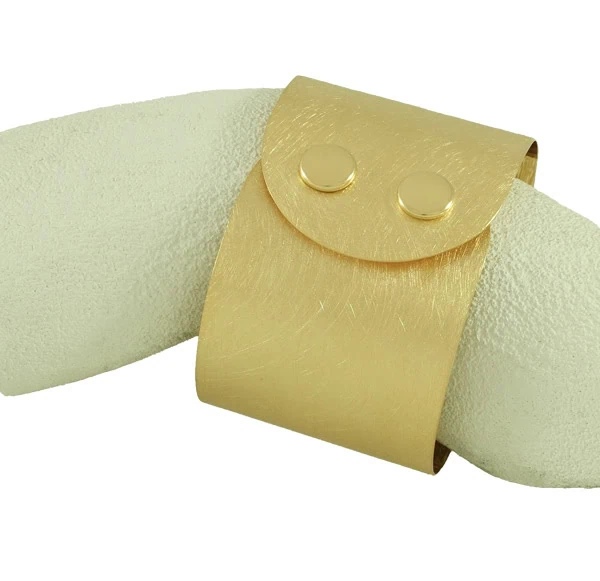 Damen Armband der Design-Linie „Atelier“, ICE matt. Manschettenarmband in Silber 925/000 Gelbgold mit Druckknopf Verschluss: Breite: 45 mm. Durch flache und federnde Verarbeitung hat dieses Damen Armband einen sehr hohen Tragekomfort. Dein Armband setzt Deine Individualität in Szene und trägt sich wie eine zweite Haut. Circa 50 Gramm schwer. Gegen unvorsichtiges Abstreifen/Verlieren, doppelt mit einer Druckknopfschließe gesichert – Click Button System. Wir fertigen die „Atelier“ Kollektion in vielen Längen, passend für Deinen Armumfang, auf Wunsch auch in Gelbgold-Weißgold-Roségold.