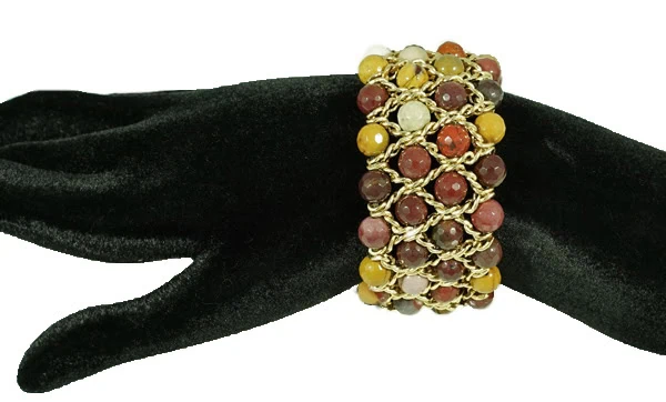 Damen Armband Serie „Must“ 4 reihig. Breite 35 mm, mit facettierten Jaspis Kugeln und Gelbgold. Dieses Armband umspielt Ihr Handgelenk in lässiger Eleganz mit einem Anklang edler maurischer Handwerkskunst. Erhältlich in verschiedenen Breiten, 4-reihig 35 mm oder 6-reihig 50 mm. Hoher Tragekomfort mit Griffin Juwelry Elastic Cord. Ein äußerst tragbares und ultra-glamouröses It-Piece. Für einen aufsehenerregenden Look ist gesorgt.