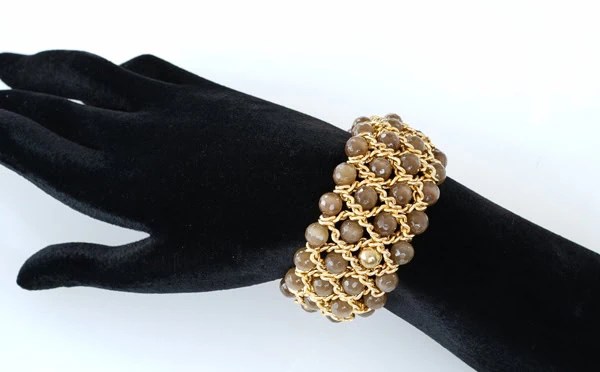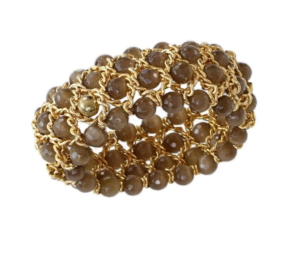 Damen Armband „Must“ 4 reihig Katzenauge: Breite 35 mm, aus facettierten Quarz Katzenauge Kugeln und Gelbgold Zwischenelementen. Dieses Armband umspielt Ihr Handgelenk in lässiger Eleganz mit einem Anklang edler maurischer Handwerkskunst. Ein unaufdringlicher Hingucker, der Ihre individuelle Persönlichkeit betont. Erhältlich in verschiedenen Breiten, 4-reihig 35 mm oder 6-reihig 50 mm in attraktiven, nuancierten Farbvarianten, die einen angenehmen Kontrast zu Ihrem Teint bilden. Hoher Tragekomfort mit Griffin Juwelry Elastic Cord.