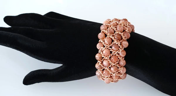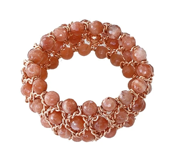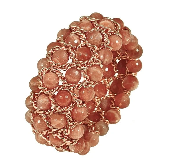 Armband „Must“ 4 reihig. Breite: 35 mm, aus facettierten Mondstein Kugeln und Rotgold Zwischenelementen. Erhältlich in verschiedenen Breiten, 4-reihig 35 mm oder 6-reihig 50 mm. Mit Griffin Juwelry Elastic Cord. Mit diesem Armband aus der Must Kollektion lenken Sie alle Blicke auf sich.