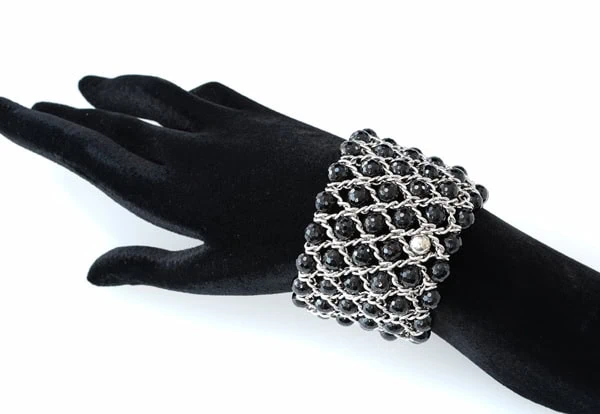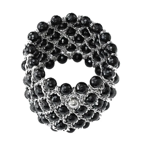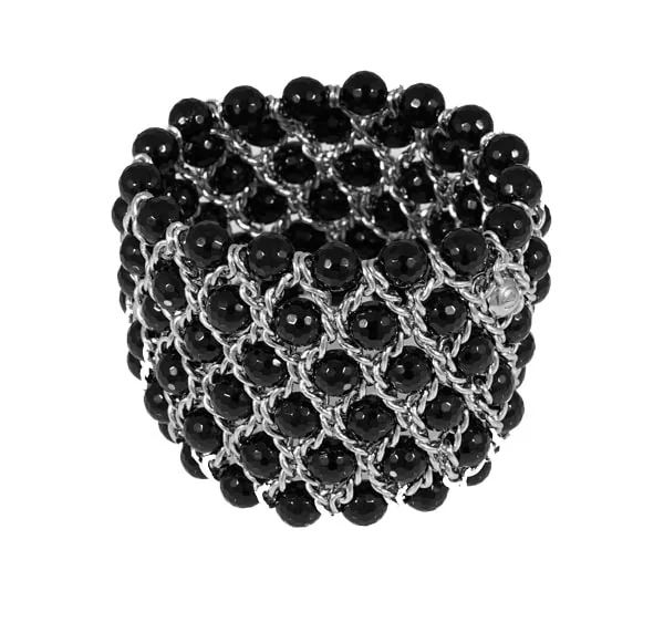 Dieses beeindruckende Armband besteht aus zahlreichen facettierten Onyx-Perlen, die in einem kunstvollen Design angeordnet sind. Die schwarzen Onyx-Perlen sind facettiert, wodurch sie ein faszinierendes Lichtspiel erzeugen und dem Band eine elegante Ausstrahlung verleihen. Die Perlen sind in ein Netz aus silbernen Ketten eingefasst, das dem Armband Struktur und Stabilität verleiht. Dieses ausdrucksstarke Schmuckstück ist sowohl modern als auch klassisch und eignet sich hervorragend, um einem Outfit einen Hauch von Glamour und Raffinesse zu verleihen.
