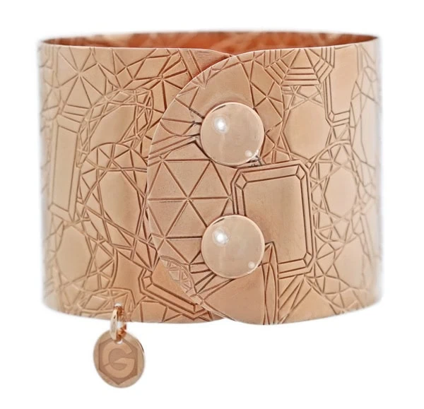 Damen Armreif der Serie „Atelier“, mit Diamant-Cut Muster in Rotgold, Sterling Silber 925/000. Der Damen Armreif hat eine Druckknopf Sicherung, die vor Verlust schützt. Click-Button System. Breite: 45 mm. Alle Manschetten Armspangen der Kollektion „Atelier“ haben einen sehr guten Tragekomfort durch flache, federnde Verarbeitung.