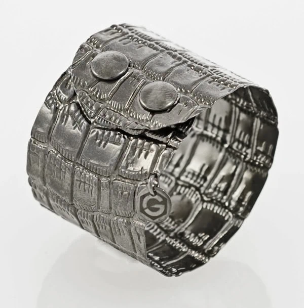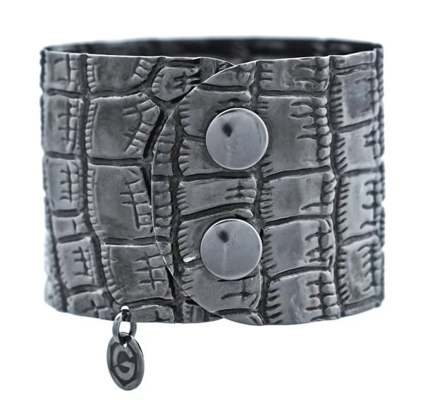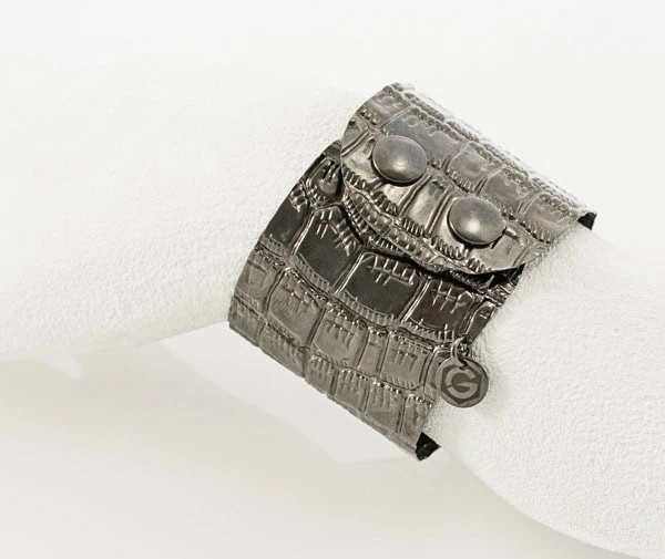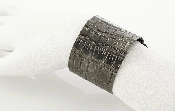 Damen Armreif der Serie „Atelier“. Kroko Prägung in Sterling Silber 925/000. Schwarz rhodiniert, Breite: 45 mm. Der Damen Armreif ist durch eine Druckknopf Sicherung doppelt gegen Verlust gesichert. Alle Armschmuck Artikel der „Atelier“ Kollektion haben durch die flache Verarbeitung einen sehr hohen Tragekomfort. Wir fertigen diese Damen Armreif Serie in Silber, Gold, Rosegold und Platin. Auch sind individuelle Tattoos/Gravuren möglich. Entsprechend deines Armumfanges fertigen wir die passende Länge.