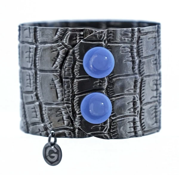 Damen Armreif der Serie „Atelier“ in Sterling Silber 925/000 mit Kroko Prägung. Schwarz rhodiniert mit Doppel Verschluss in Blau-Achat. Breite: 45 mm. Flach gearbeiteter, breiter Damen Armreif der nicht aufträgt. Deshalb haben alle Armschmuck Artikel der „Atelier“ Kollektion einen sehr hohen Tragekomfort. Gegen unvorsichtiges Abstreifen/Verlieren, doppelt mit einer Druckknopf Schließe gesichert – Click Button System. Wir fertigen diese Serie auch auf Maß in allen Edelmetallen.