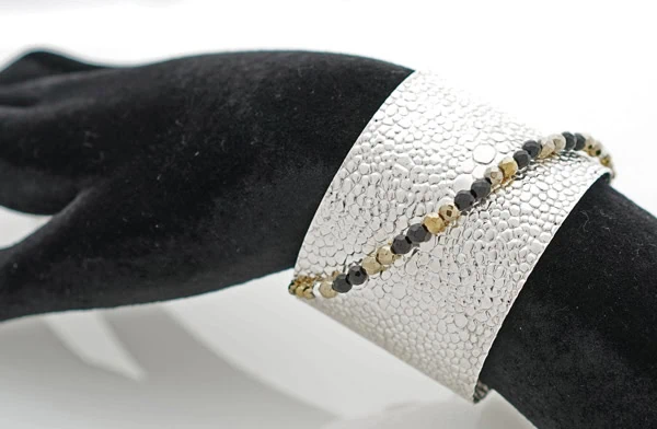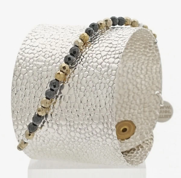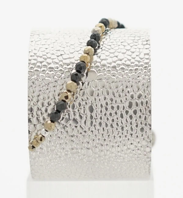 Damen Armspange aus der „Atelier“ Kollektion mit Reptilien Prägung. Die Damen Armspange ist in Sterling Silber 925/000 mit facettierten Onyx und Hämatit Perlen in Handarbeit gefertigt. Dieses Armband ist mit einem Druckknopf Verschluss – Click Button System gegen Verlust doppelt gesichert. Breite: 45 mm. Manschetten Damen Armspange. Alle Armschmuck Artikel der „Atelier“ Kollektion haben durch die flache Verarbeitung einen sehr hohen Tragekomfort. Wir fertigen die Damen Armspangen in Silber, Gold, Weißgold, Rosegold und Platin. Ein Tattoo/Gravur nach deinen Wünschen ist auch möglich.