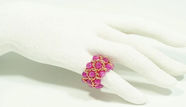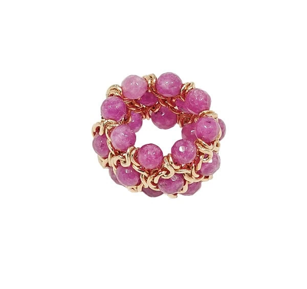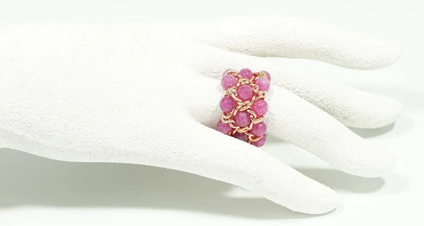 Damen Ring „Must“ 3 reihig. Breite: 20mm, aus facettierten Rosa Jade Kugeln. Gelbgold. (Ringweite von 52-58 flexibel) Auf Griffin Juwelry Elastic Cord – Stretch Magic gefertigt. Das edle Accessoire verleiht jedem Outfit im Handumdrehen eine glamouröse Note