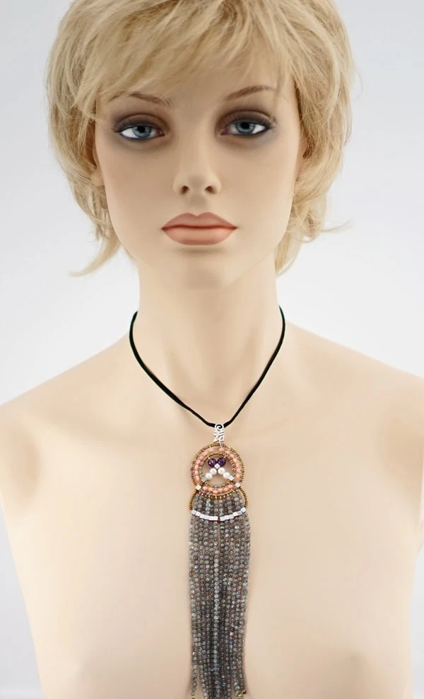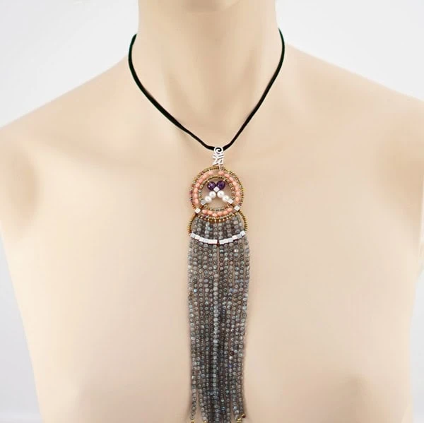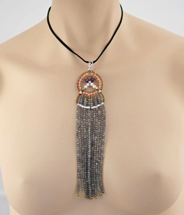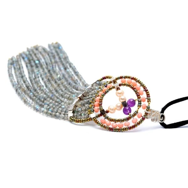 Halskette „Seduction“ Pink Small mit Koralle, Amethyst, Labradorit, Perlen, Pyrit, Murano Beads und Sterling Silber 925/000. Ob Jeans oder Cocktailkleid, die vielseitige Kreation passt zu jedem Outfit. Immer eine Augenweide. Eine Halskette mit der besonderen Note.