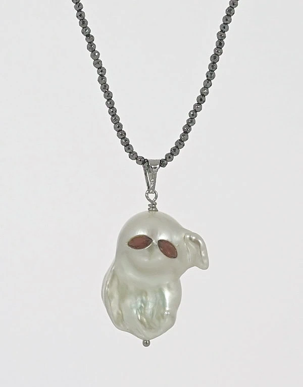 Kette „Ghost“ 3. Anhänger aus einer Naturperle mit Granat-Augen im Navette-Schliff. Kette aus facettierten Hämatit Beads. 925/000 Silber. Länge: 80 cm. Unikat, da die Perle so natürlich gewachsen ist.