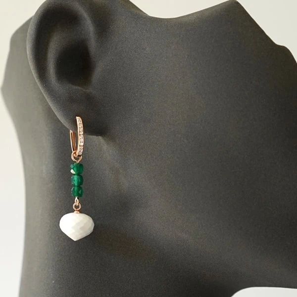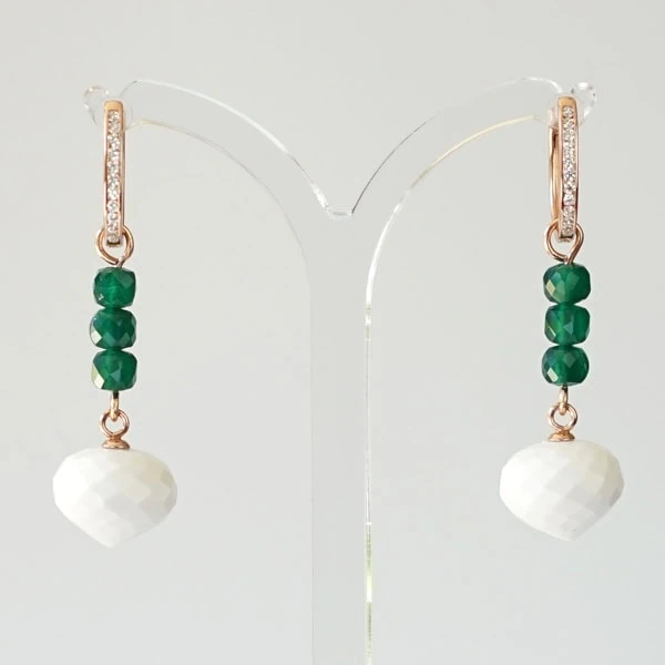 Diese eleganten Ohrringe kombinieren die edlen Materialien Roségold, Zirkonia, Grünachat und weißen Opal (Kascholong) zu einem stilvollen Schmuckstück. Die Ohrhänger bestehen aus zarten Creolen aus Roségold 925/000 Silber, die mit funkelnden Zirkonia besetzt sind und für einen dezenten Glanz sorgen. Von jeder Creole hängt ein Anhänger, der aus drei facettierten Grünachat-Perlen besteht. Am Ende des Anhängers befindet sich eine größere, facettierte Perle aus weißem Opal, die einen schönen Kontrast zu den grünen Achaten bildet. Die Kombination aus dem warmen Roségold, den schimmernden Zirkonia, dem kräftigen Grün des Achats und dem strahlenden Weiß des Opals verleiht den Ohrringen eine elegante und luxuriöse Ausstrahlung. Sie sind perfekt geeignet, um jedem Outfit einen Hauch von Raffinesse und Farbe zu verleihen.