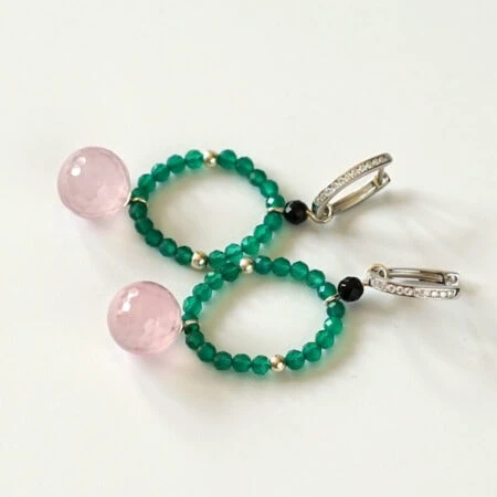 Die abnehmbaren Einhänger setzen einen besonderen Akzent: Ein Ring aus facettiertem grünem Achat, ergänzt durch Onyx und eine zart schimmernde Kugel aus Rosa Quarz, verleiht den Ohrringen Tiefe und eine feminine Ausstrahlung. Die Kombination der Edelsteine sorgt für einen spannenden Kontrast aus Frische, Ruhe und Eleganz.