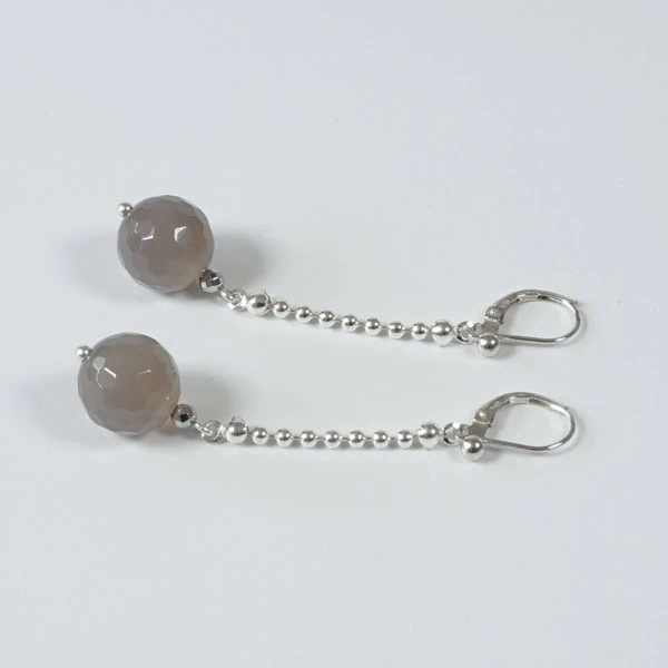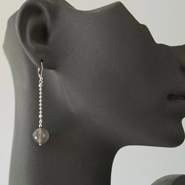 Diese stilvollen Ohrringe zeichnen sich durch eine lange, filigrane Kette aus, die aus einer Reihe kleiner, silberner Kugeln besteht. Die Kette hängt an einem dezenten, silbernen Haken (Clip Brisur), die sicher im Ohrläppchen sitzt. Am Ende der Kette befindet sich ein großer, facettierter grauer Mondstein, der einen dezenten Schimmer und Eleganz verleiht. Die Kombination aus den glänzenden Silberkugeln und dem schimmernden Mondstein sorgt für einen modernen und eleganten Look, der sowohl für den täglichen Gebrauch als auch für besondere Anlässe geeignet ist.
