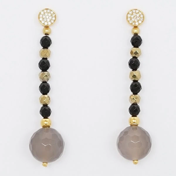 Ohrringe Gelbgold in Silber 925/000, mit Einhänger in facettierten Mondstein, Hematin und Onyx Perlen. Wir fertigen die Ohrringe in drei Gold-Farben und in unterschiedlichen Längen. Die Ohrstecker kannst Du auch ohne Einhänger tragen.