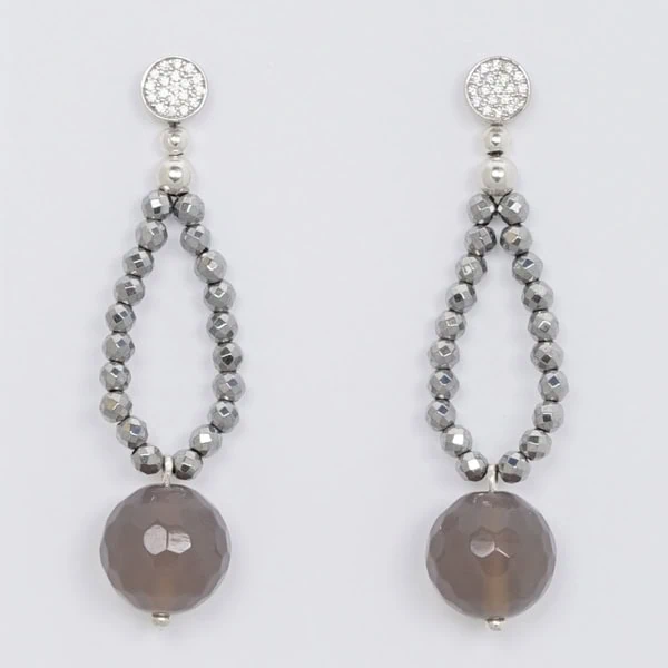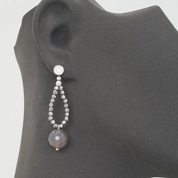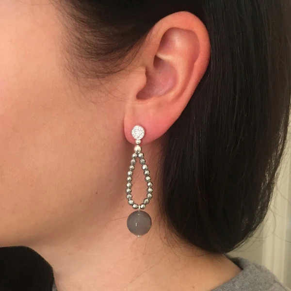 Ohrringe Weissgold in Silber 925/000 rhodiniert, mit Einhänger in Mondstein und facettierten Hematinkugeln. Wir fertigen die Ohrringe in drei Gold-Farben und in unterschiedlichen Längen. Die Ohrstecker kannst Du auch ohne Einhänger tragen.