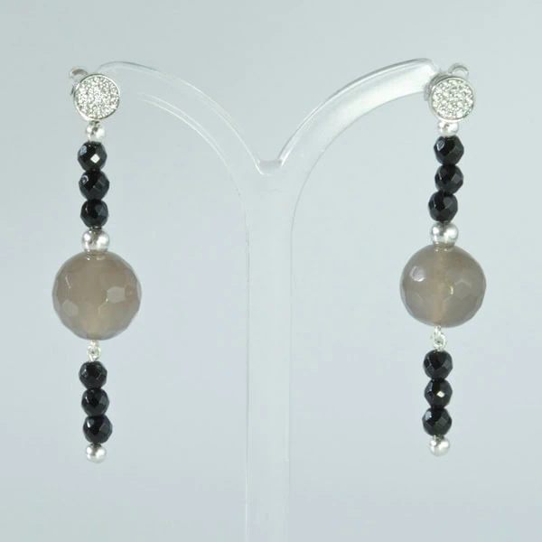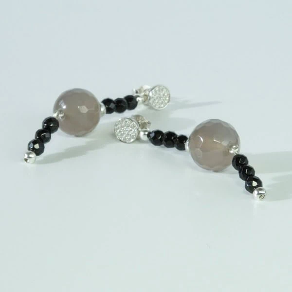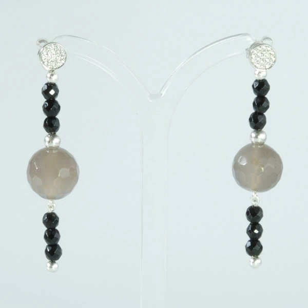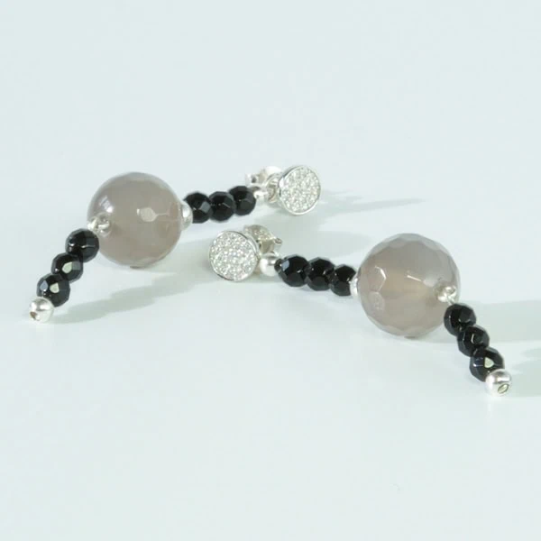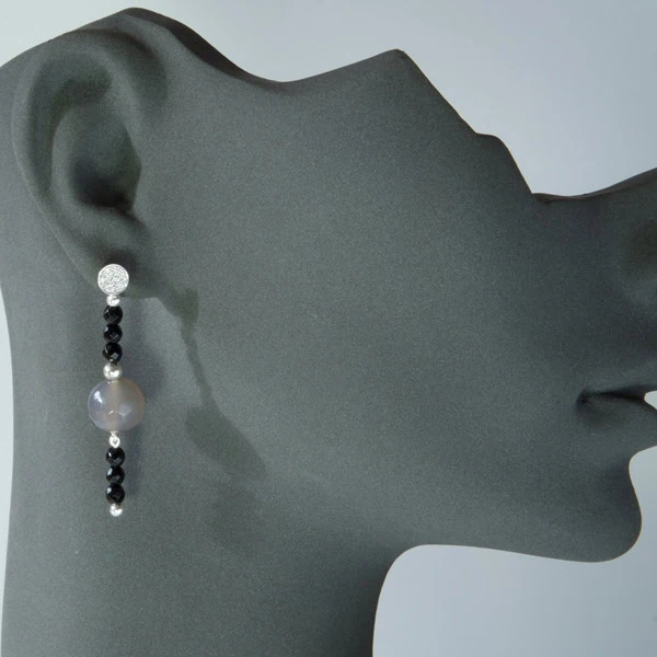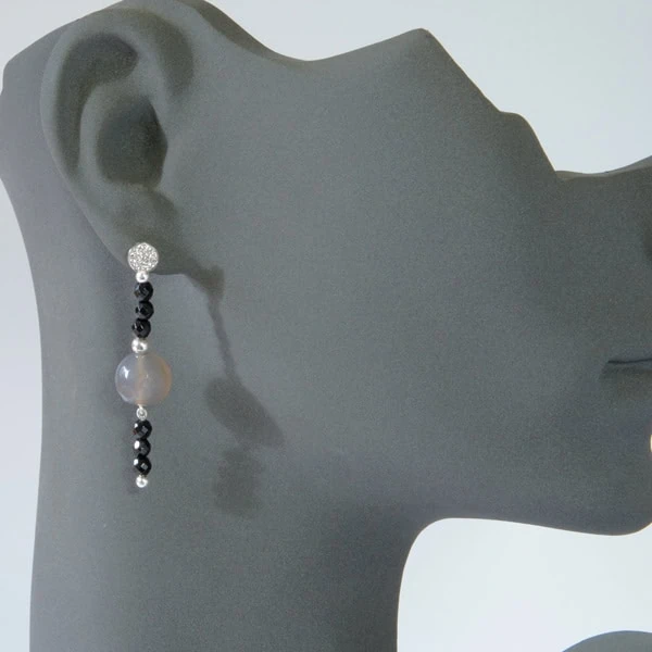 Ohrringe Weissgold in Silber 925/000 rhodiniert, mit Einhänger in facettierten Mondstein und Onyx Kugeln. Wir fertigen die Ohrringe in drei Gold-Farben und in unterschiedlichen Längen. Die Ohrstecker kannst Du auch ohne Einhänger tragen.