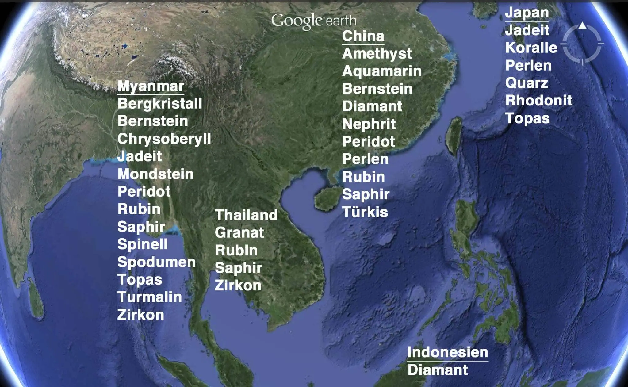 Die Verteilung der Edelsteinlagerstätten über die Erde ist nicht gleichmäßig. Einige Regionen sind deutlich bevorzugt. (vgl. Weltkarten im Anhang).