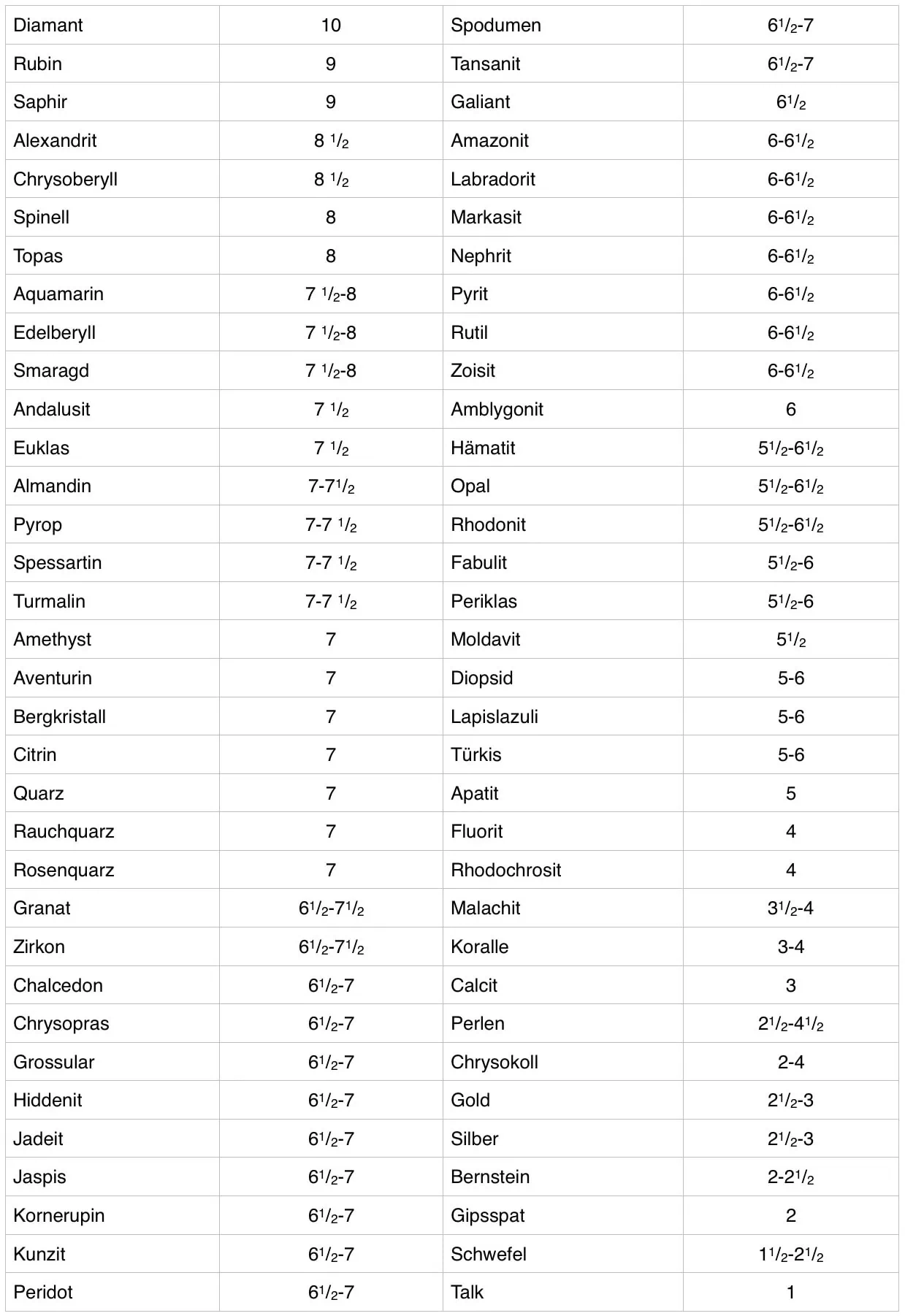 Alle uns heute bekannten Mineralien und Edelsteine sind dieser Mohsschen Härteskala zugeordnet.