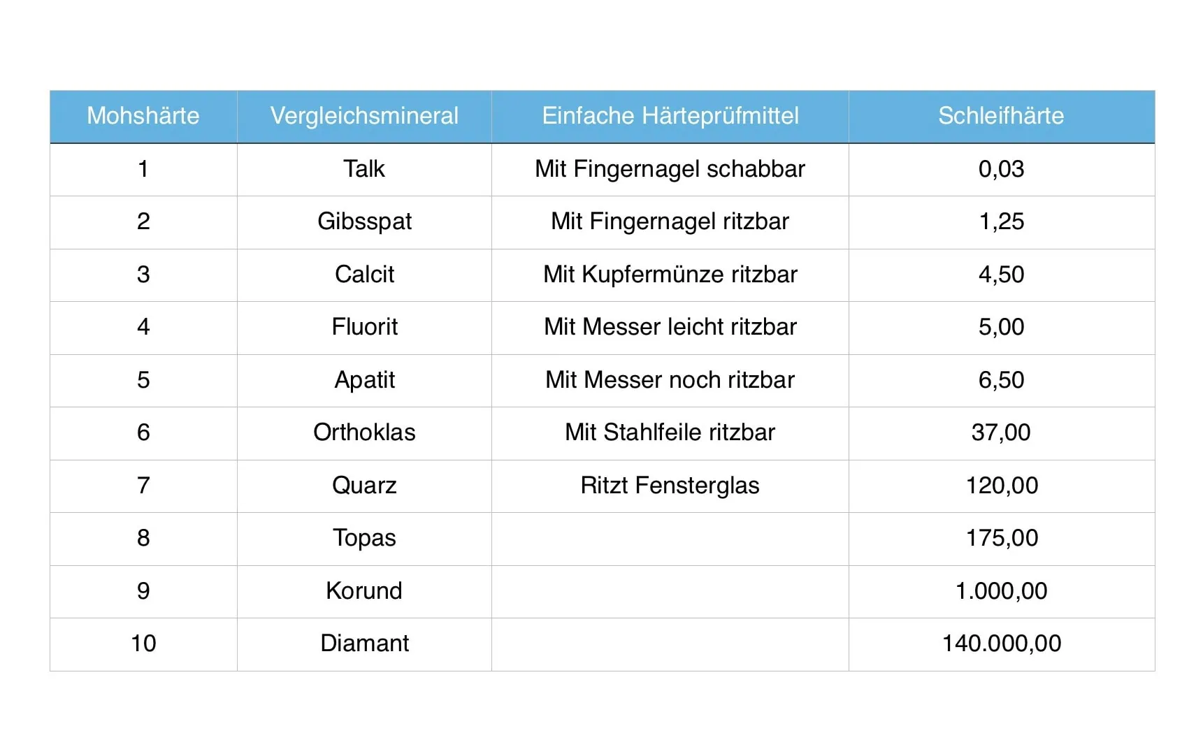 Die Mohssche Härteskala ist eine relative Härteskala. Mit ihr kann man nur feststellen, welcher der Edelsteine härter als ein anderer ist. Über das Maß der Härtezunahme innerhalb der Skala erhält man keine Auskunft. Solches ist nur bei absoluten Härteskalen, wie z.B. bei der Schleifhärte möglich.